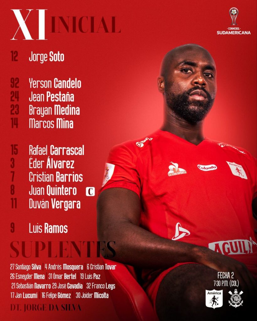 El partido comenzará a las 19:30 horas de Colombia (dos horas más en Brasil), y el técnico uruguayo Jorge Da Silva ya confirmó la alineación para este choque frente a Corinthians en el mítico Pascual Guerrero. A continuación, repasá la formación.