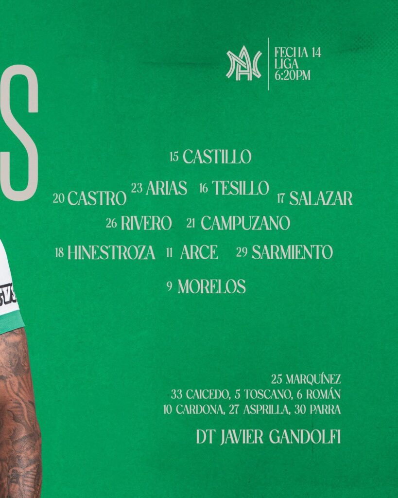 Atlético Nacional hoy se mide ante Boyacá Chico por la fecha 14 de la Liga BetPlay. Javier Gandolfi ha definido su once para este importante duelo en el Estadio Atanasio Girardot.