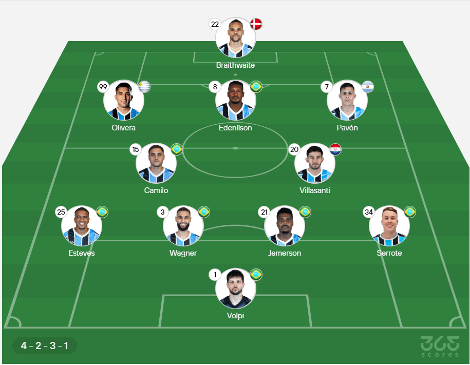 - Provável escalação do Grêmio: Volpi; Serrote, Jemerson, Wagner e Esteves; Villasanti, Camilo, Pavón, Edenílson e Olivera; Braithwaite.