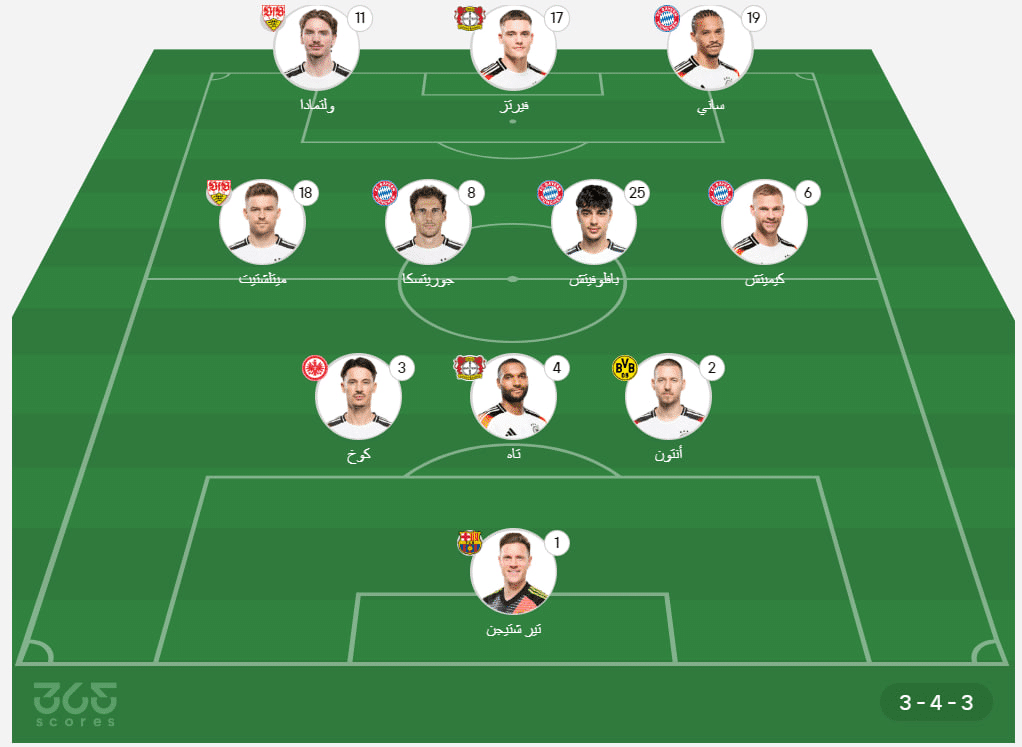 - خط الوسط: جوشوا كيميتش، ألكسندر بافلوفيتش، ليون جوريتسكا، ماكسيميليان ميتلشتيت.