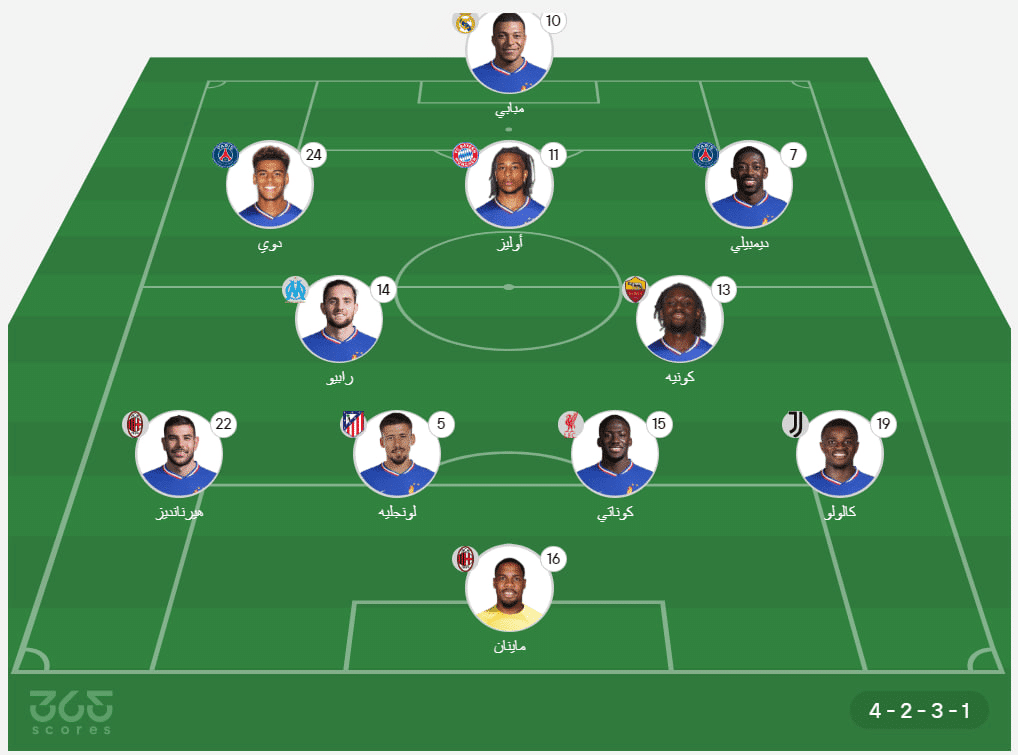 - خط الدفاع: بيير كالولو، إبراهيما كوناتي، كيلمو لونجليه، ثيو هيرنانديز.