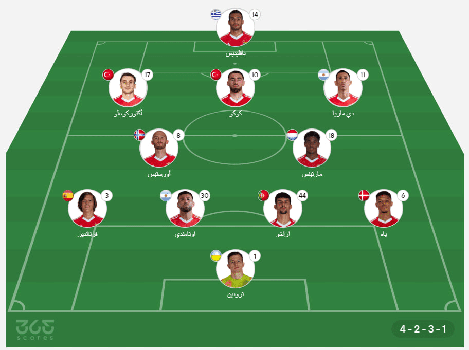 - خط الوسط الهجومي: أنخيل دي ماريا، أوركون كوكو، كريم أكتوركوغلو.