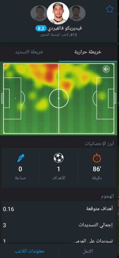 لاعب الميرينجي نجح في إعادة فريقه للمباراة بعدما سجل هدف التعادل، بالإضافة إلى أنه قدم 39 تمريرو صحيحة من أصل 47 بمعدل نجاح وصل إلى 83%، كما إنه لمس الكرة في 67 مرة خلال 84 دقيقة شارك فيها باللقاء.