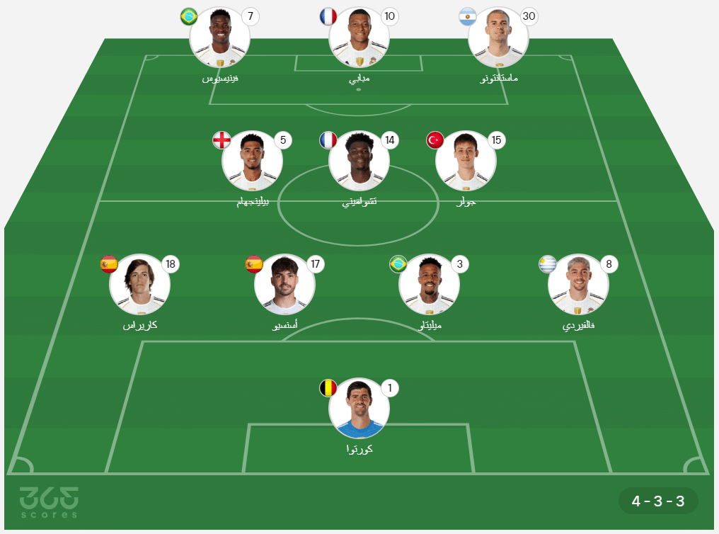 - خط الهجوم: فينيسيوس جونيور، كيليان مبابي، فرانكو ماستانتونو.