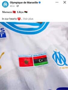 وأشار الموقع الرسمي لنادي الجنوب الفرنسي أن الفريق سيقف دقيقة صمت حدادا على أرواح ضحايا المغرب وليبيا، وسيرتدي لاعبوه قميصا يحمل رسالة “مارسيليا متضامنة”.