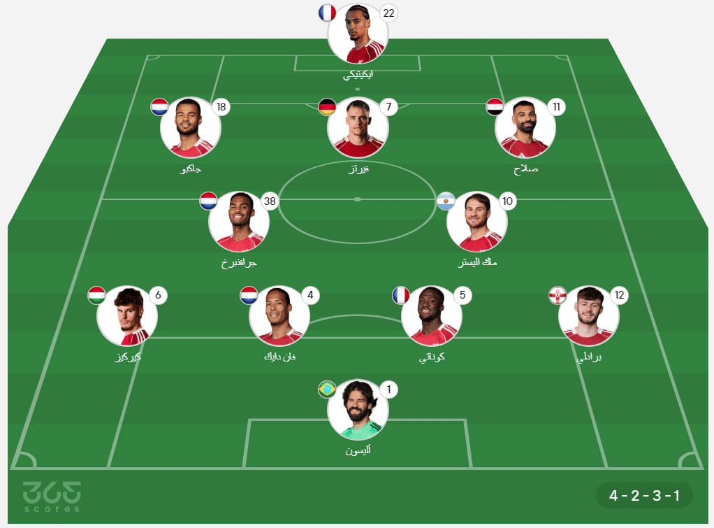 - خط الوسط الهجومي: محمد صلاح، فلوريان فيرتز، كودي جاكبو.