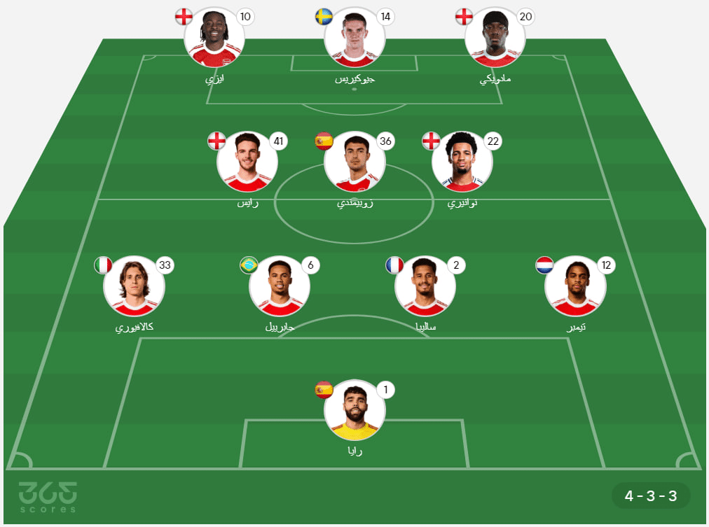 - خط الوسط: إيثان نوانيري، مارتن زوبيميندي، ديكلان رايس.