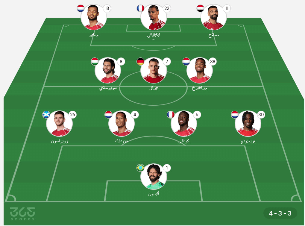 خط الدفاع: أندرو روبرتسون، فيرجيل فان دايك، إبراهيما كوناتي، جيريمي فريمبونج.