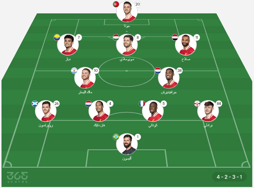 - خط الوسط الهجومي: محمد صلاح، دومينيك سوبوسلاي، لويس دياز.