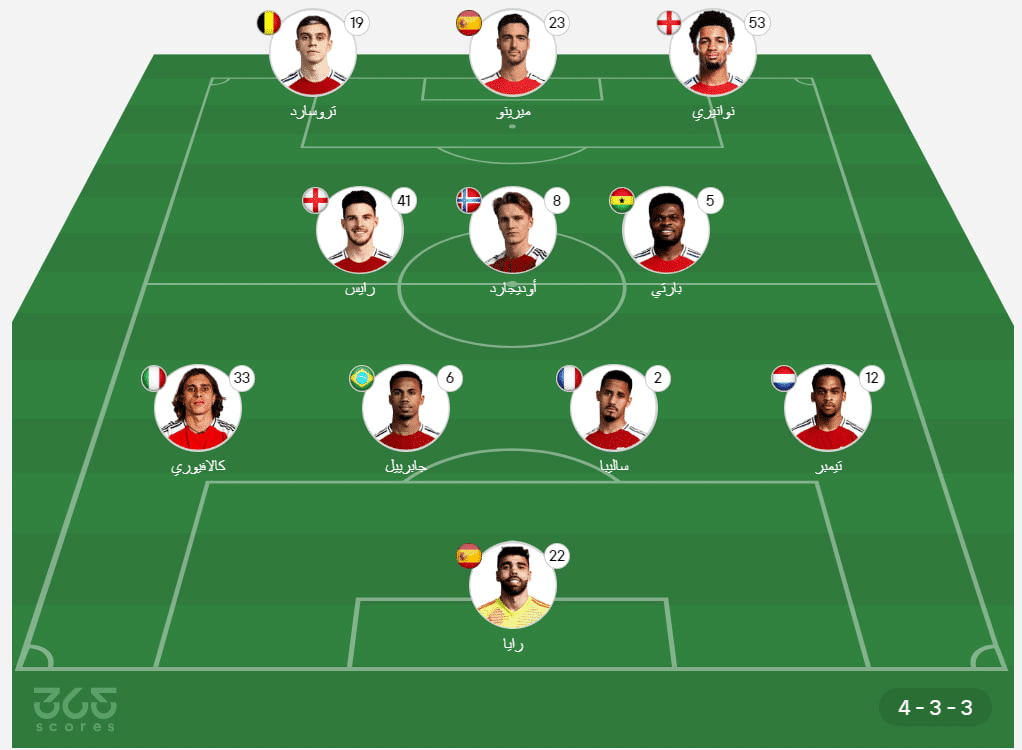 - خط الوسط: مارتن أوديجارد، جورجينيو، ديكلان رايس.