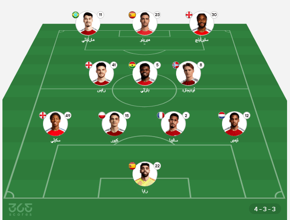 - خط الهجوم: رحيم ستيرلينج، ميكيل ميرينو، جابرييل مارتينيلي.