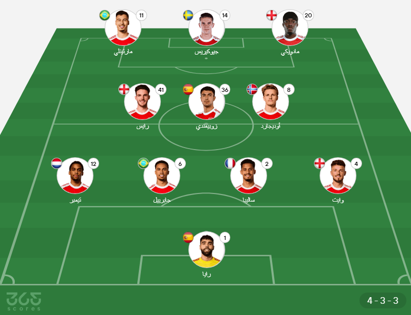 - خط الوسط: ديكلان رايس، مارتن زوبيمندي، مارتن أوديجارد