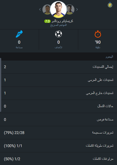 ولم يقدم رونالدو المستوى المرجو منه خلال هذه المواجهة، وتعد تلك المباراة هي الثانية لرونالدو بقميص النصر السعودي، وذلك بعدما شارك أمام الاتفاق ضمن منافسات بطولة دوري روشن السعودي.