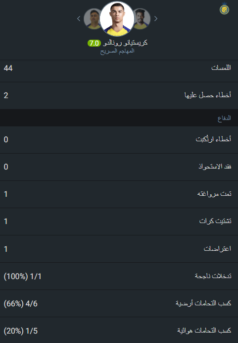 تمت مراوغة رونالدو مرة واحدة، ونجح في تشتيت الكرة مرة واحدة أيضًا، وعلى مستوى كسب الالتحامات الهوائية، نجح رونالدو في التحام واحد فقط من أصل 5 ألتحامات، بدقة وصلت إلى 20% فقط.