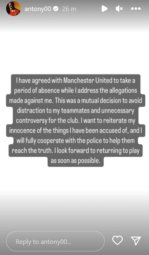 وكتب الجناح البرازيلي عبر حسابه الرسمي بموقع التواصل الاجتماعي “إنستجرام”: “لقد اتفقت مع مانشستر يونايتد على الغياب لفترة عن المباريات أثناء التحقيقات في الاتهامات الموجهة ضدي”.