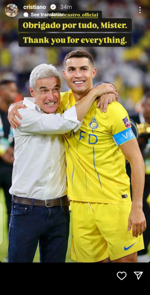 ونشر رونالدو صورة له مع لويس كاسترو وكتب عليها: “شكرًا لك على كل شيء يا معلمي”، وذلك بعد تأكد رحيله عن تدريب النصر.
