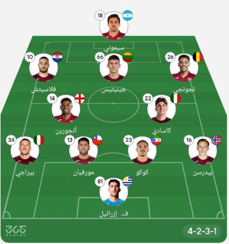 خط الوسط: دومفريس، باريلا، سوتشيتش، ميختريان، دي ماركو.