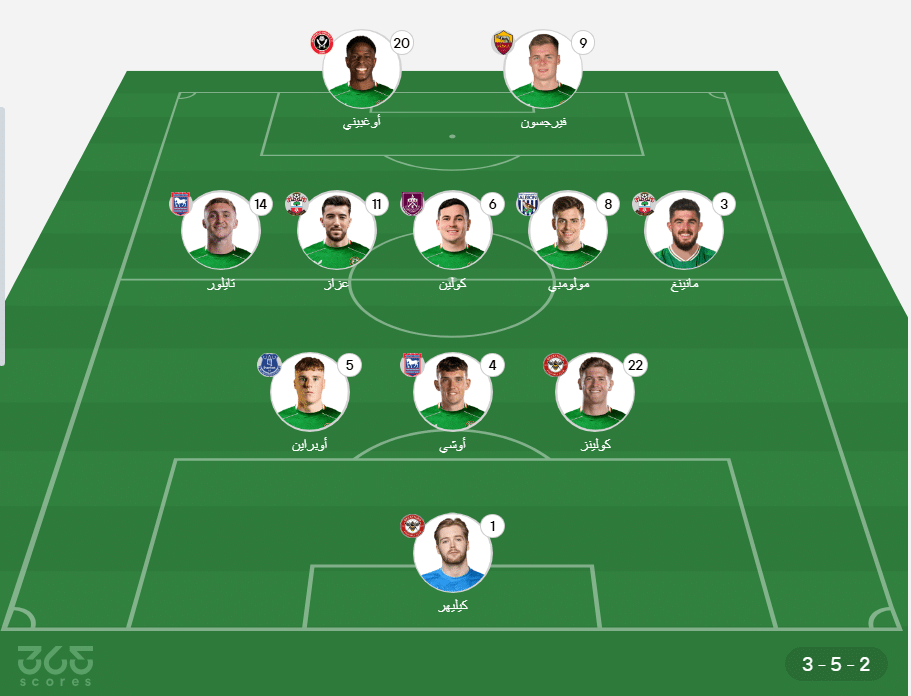 - خط الوسط: جيسون مولومبي، جوش كولين، فين عزاز، جاك تايلور