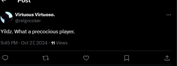 وأضاف آخر: “مدريد ضد برشلونة، أرسنال ضد ليفربول، يوفنتوس ضد إنتر ميلان. يا لها من عطلة نهاية أسبوع رائعة، يلدز يا له من لاعب مبكر النضوج”.
