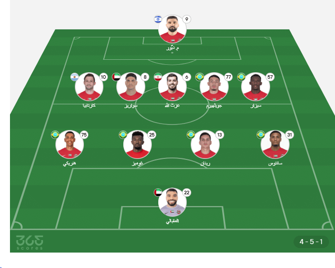 خط الوسط: سعيد عزت الله – سواريز – فيدريكو كارتابيا – يوري سيزار – جوليرمي بالا.