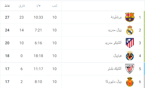 يحتل برشلونة صدارة جدول ترتيب الدوري الإسباني لهذا الموسم برصيد 27 نقطة بعد 10 جولات، بينما يأتي ريال مدريد في المركز الثاني برصيد 24 نقطة بجدول الترتيب.