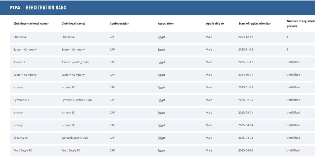 وكان ناديي الزمالك ووادي دجلة هما أحدث الأندية المصرية المنضمة إلى قائمة الممنوعين من القيد لدى الاتحاد الدولي لكرة القدم، والتي يتم تحديثها كل فترة حسب تطورات أزمات كل نادي.