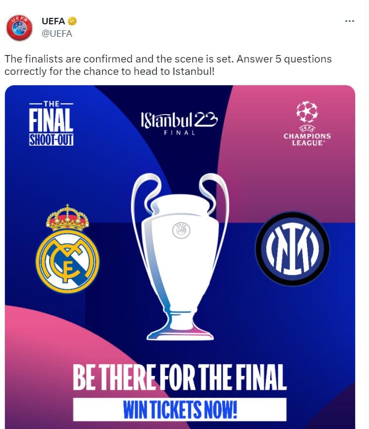 قام حساب الاتحاد الأوروبي لكرة القدم “يويفا” بإصدار تغريدة توضح أن نهائي دوري أبطال أوروبا لموسم 2022/2023 قد تم تحديد طرفيه قبل انتهاء مباريات نصف النهائي.