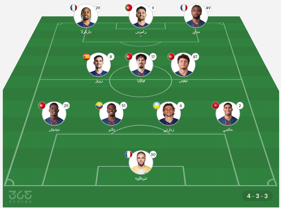 - خط الدفاع: نونو مينديش، ويليان باتشو، إليا زبارني، أشرف حكيمي.