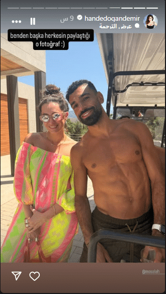 وظهر محمد صلاح، رفقة الفنانة التركية هاندا دوجانديمير، والتي نشرت صورة لها مع النجم المصري، والتي كتبت تعليقًا عليها: “الصورة التي نشرها الجميع ماعدا أنا”.