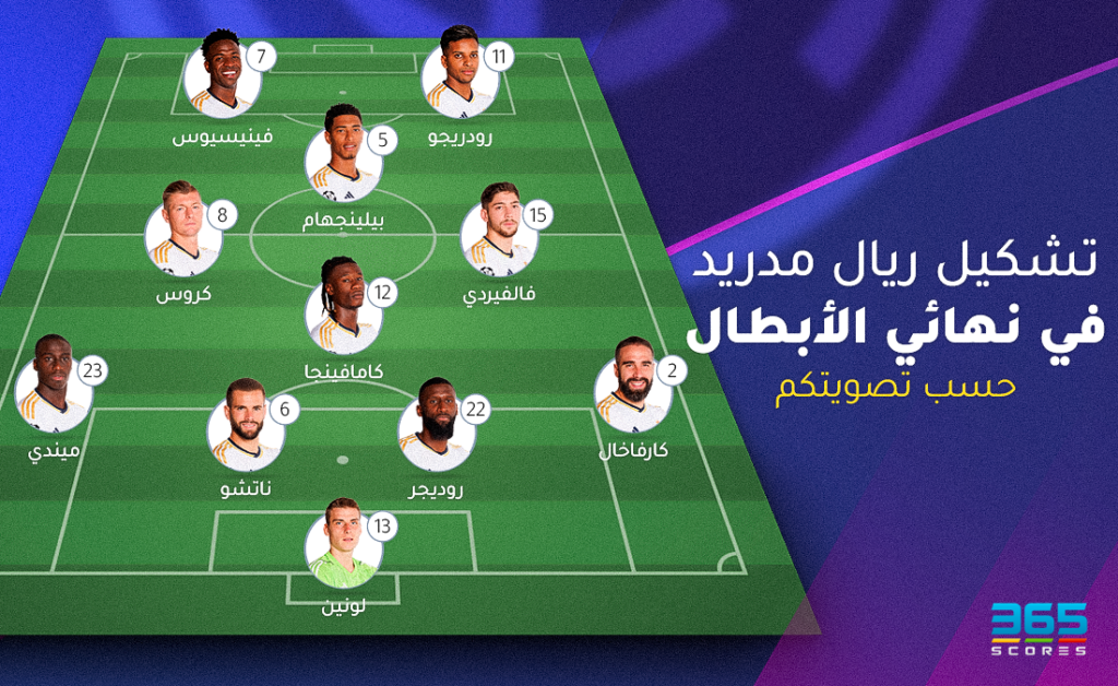 على أن يتم الإعلان عن تشكيل ريال مدريد في نهائي دوري أبطال أوروبا 2024 وفقًا لاختيارات متابعي 365Scores بالكامل، يوم الجمعة الموافق 31 مايو 2024.
