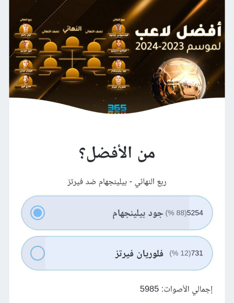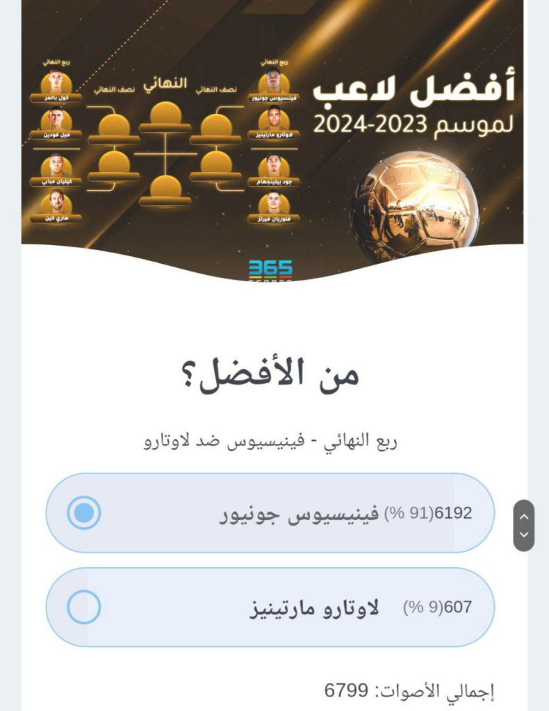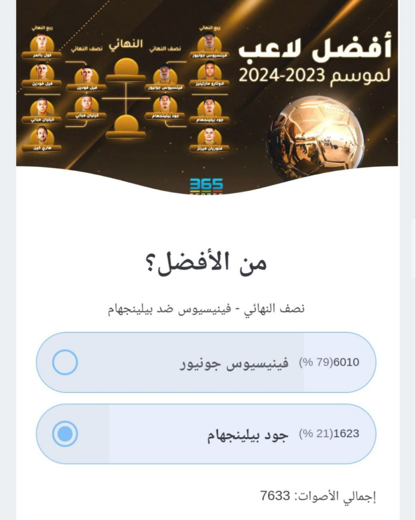 باكتساح من فينيسيوس جونيور لزميله في ريال مدريد جود بيلينجهام، تأهل البرازيلي إلى المواجهة النهائية، بعدما حصل في تصويت المواجهة الأولى من نصف النهائي على 6010 صوت.