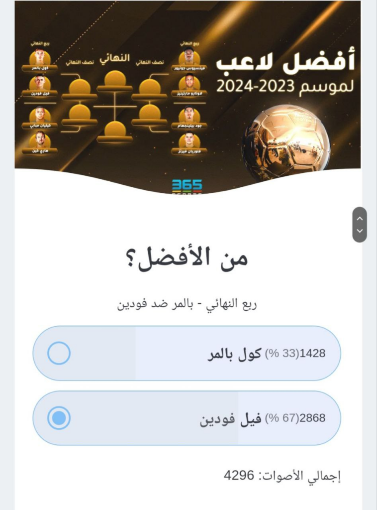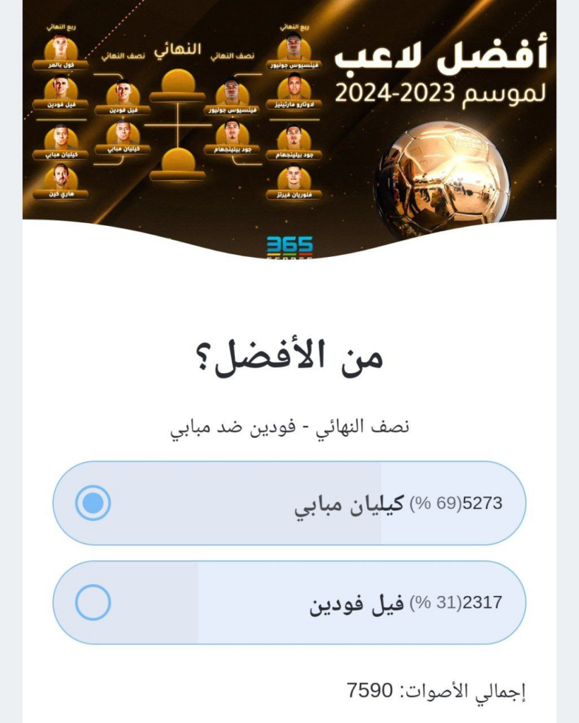حصل كيليان مبابي على 5273 صوت بينما حصل فيل فودين على 2317 صوت فقط.