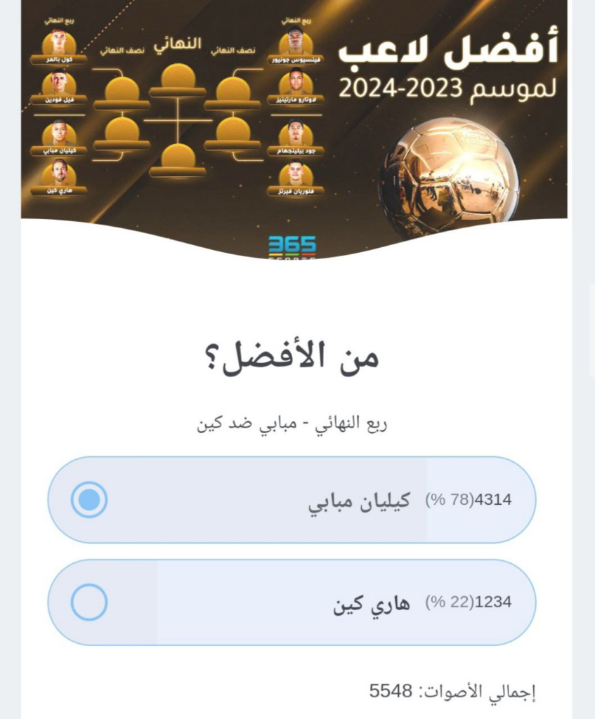 الفرنسي كيليان مبابي حسم تصويت المواجهة الثانية بعد فوزه على الإنجليزي فيل فودين بفارق كبير ليتأهل إلى المواجهة النهائية.