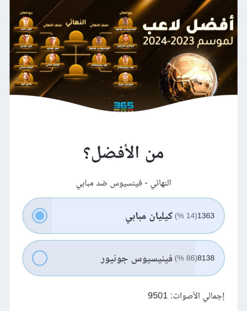 حصل فينيسيوس على مجموع أصوات 8138، بينما حصل كيليان مبابي على 1363 صوت فقط.