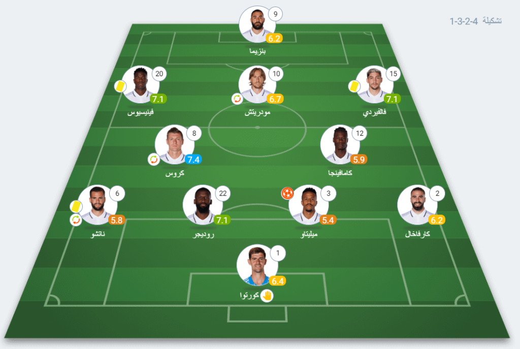 خط الوسط الهجومي: فالفيردي (7.1)، لوكا مودريتش (6.7)، فينيسيوس جونيور (7.1).