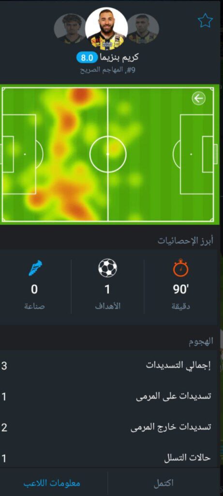 مهاجم النمور نجح في إحراز الهدف الوحيد في المباراة ونجح في الصعود بفريقه للدور ربع النهائي، بالإضافة إلى أن بنزيما قدم 59 تمريرة صحيحة من أصل 66 بمعدل نجاح وصل إلى 89%.