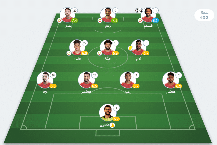 خط الوسط الهجومي: حسين الشحات 8.6 ، إمام عاشور 6.3 ، طاهر محمد طاهر 7.4