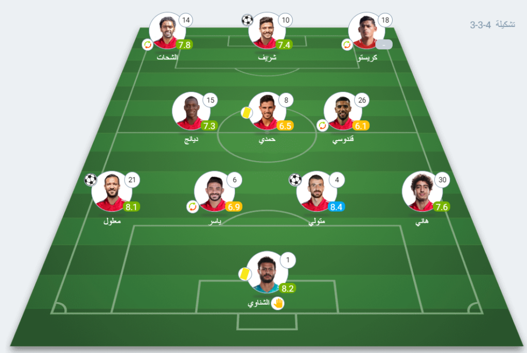 خط الهجوم: كريستو (-)، محمد شريف (7.4)، حسين الشحات (7.8).