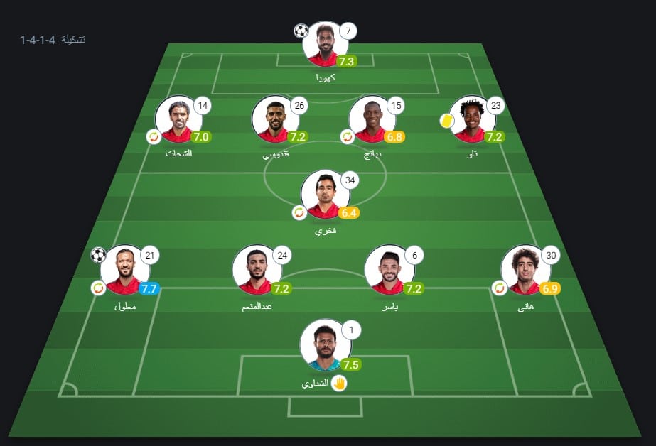 خط الوسط: أليو ديانج 6.8 – أحمد قندوسي 7.2 – محمد فخري 6.4 – حسين الشحات 7.0 – بيرسي تاو 7.2.