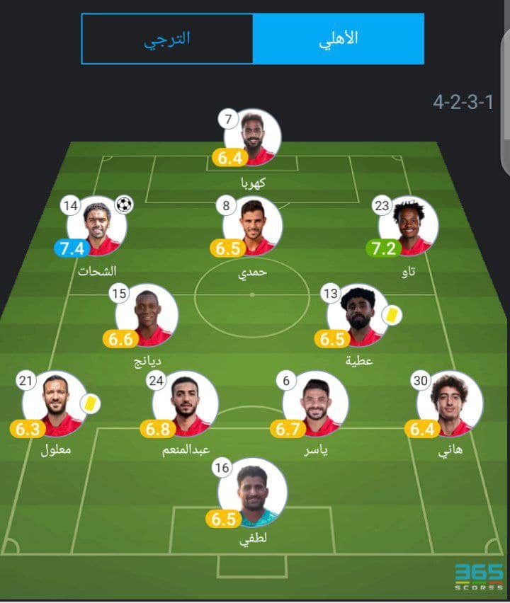 خط الوسط: مروان عطية 6.5 – أليو ديانج 6.6 – بيرسي تاو 7.2 – حمدي فتحي 6.5 – حسين الشحات 7.4