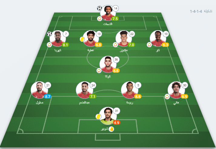 خط الوسط: مروان عطية 6.8، أحمد نبيل كوكا 6.6، إمام عاشور 7.0.