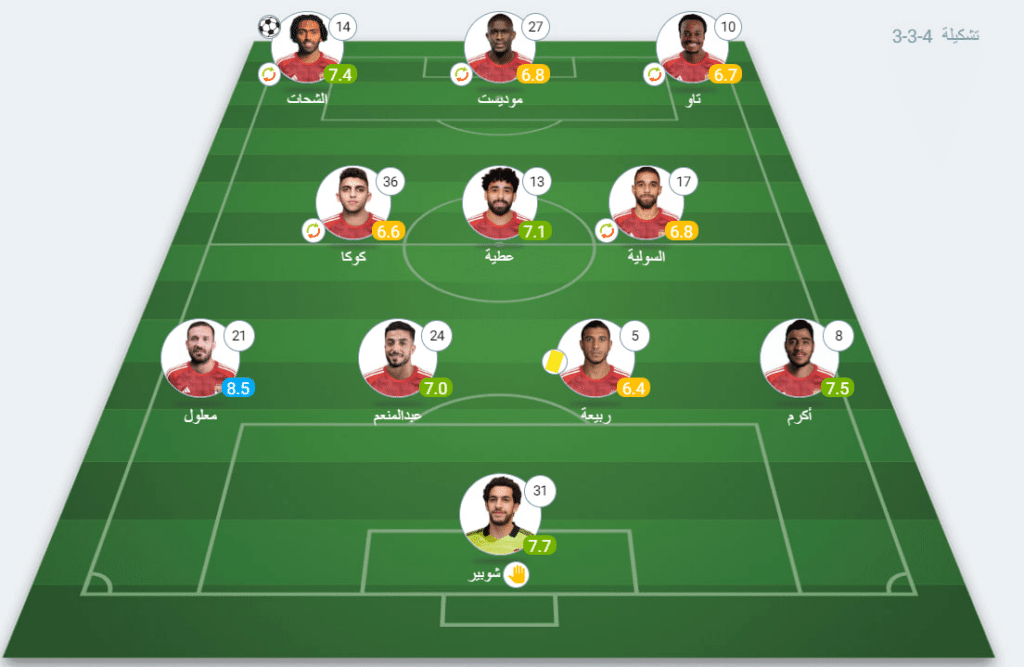 خط الهجوم: بيرسي تاو (6.7)، موديست (6.8)، حسين الشحات (7.4).