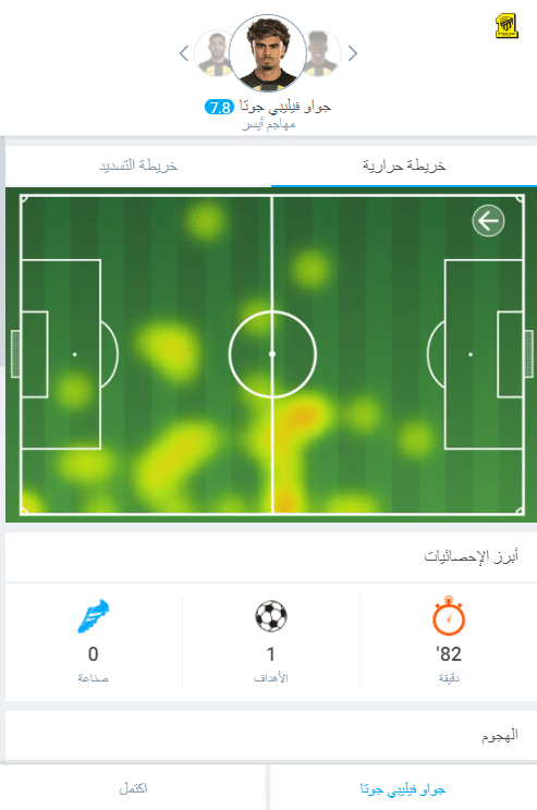 ونجح لاعب الوسط البرتغالي من تسجيل هدف الفوز لصالح الاتحاد، بالإضافة إلى أنه قدم 16 تمريرة صحيحة من أصل 22 خلال 82 دقيقة شارك فيها في المباراة بمعدل نجاح وصل إلى 73%.