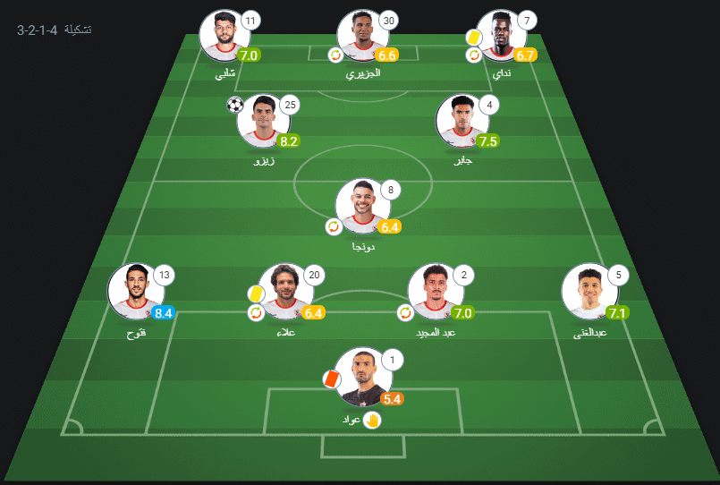 خط الوسط : نبيل عماد دونجا 6.4 – عمر جابر 7.5 – أحمد سيد “زيزو” 8.2
