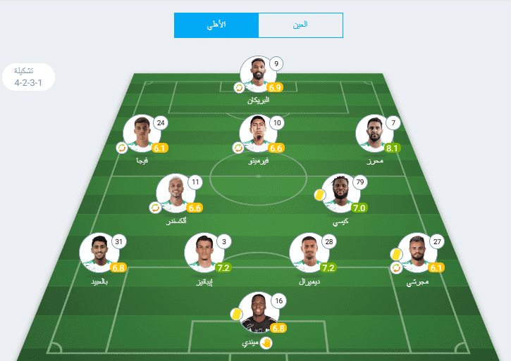 الهجوم: رياض محرز”8.1″، روبرتو فيرمينو”6.6″، فراس البريكان”6.9″.