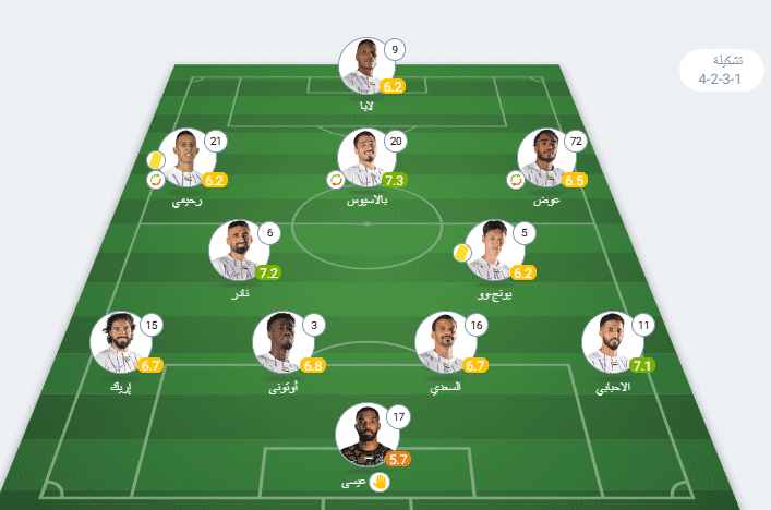 الدفاع: علي مجرشي”6.1″، ميريح ديميرال”7.2″، روجير إيبانيز”7.2″، سعد بالعبيد”6.8″.