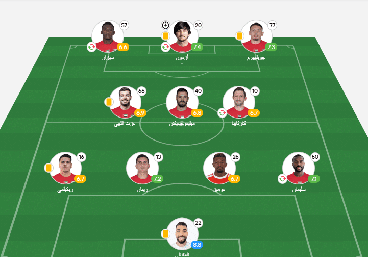 الهجوم: لابا كودجو”5.6″، سفيان رحيمي”7.6″، محمد عوض الله”6.7″.