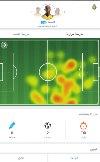 حصل البرازيلي أندرسون تاليسكا لاعب النصر على أعلى تقييم بين اللاعبين بنسبة 9.6 نقطة من أصل 10 نقاط بعدما قدم مباراة مميزة مع الفريق ونجح في تسجيل الهدف الأول والرابع في شباك الفيحاء.