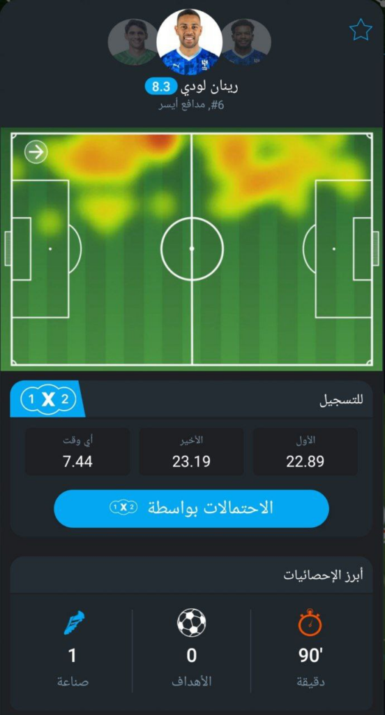 وحصل رينان لودي لاعب فريق الهلال على أعلى نسبة تقييم بين لاعبي الفريقين، على الرغم من عدم تسجيله لأي هدف، إلا أنه صنع هدف الزعيم الثاني، إلى جانب تشكيله لفرصتين خطيرتين على المرمى.