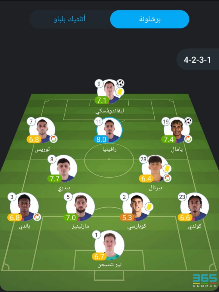 خط الهجوم: لامين يامال 7.4، روبرت ليفاندوفسكي 7.1، فيران توريس 6.8